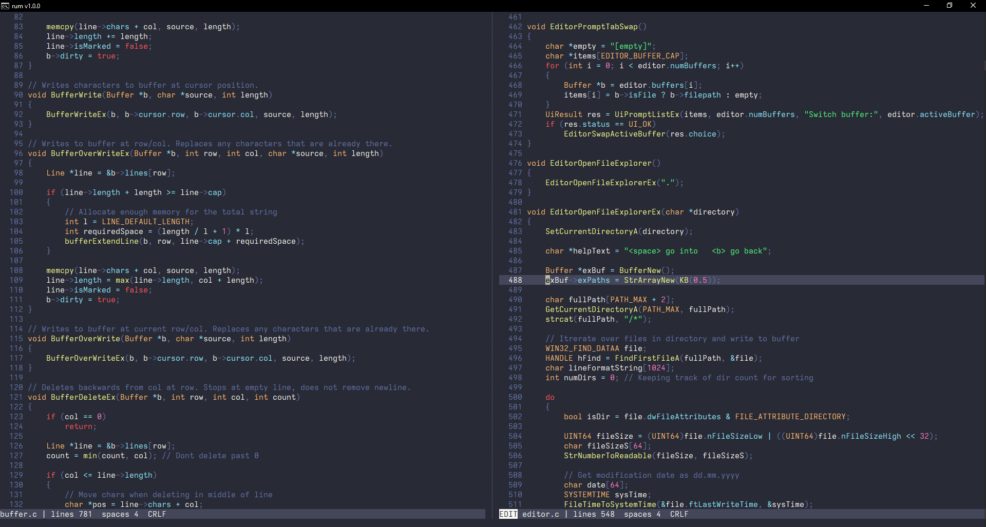 Rum is a fast and minimal editor that supports syntax highlighting, search, split buffers, tabs and much more! It is specifically made for the windows terminal using the win32 console API. It has no other dependencies than libc and win32, making it very lightweight (~70kb) and easy to build!